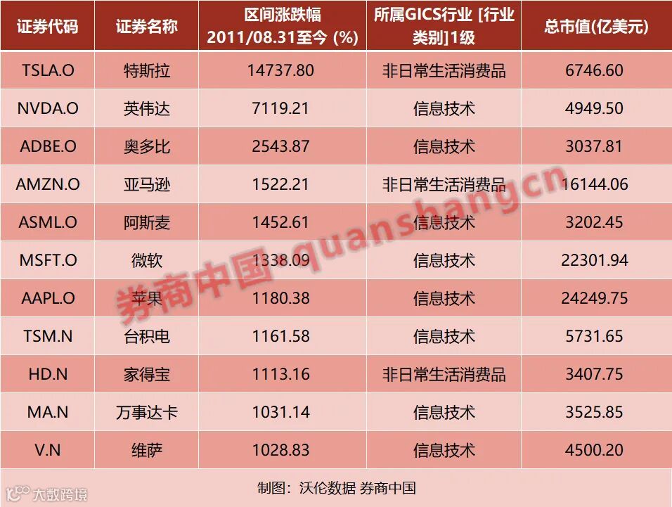 如果从过去10年涨幅榜来看,美股10年10倍且市值超过3000亿美金的公司共有11只,实际上除了传统经济的家得宝外,其余公司均为新经济公司。