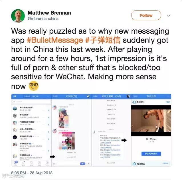 近日,有国外媒体人在 Twitter 曝出子弹短信含有色情和违禁内容。他晒出了一些群聊内容截图,表示在玩了几个小时后,终于搞明白这个 app 快速火起来的原因,「(对子弹短信的)第一印象就是充满了色情和其他被微信屏蔽的敏感内容」。