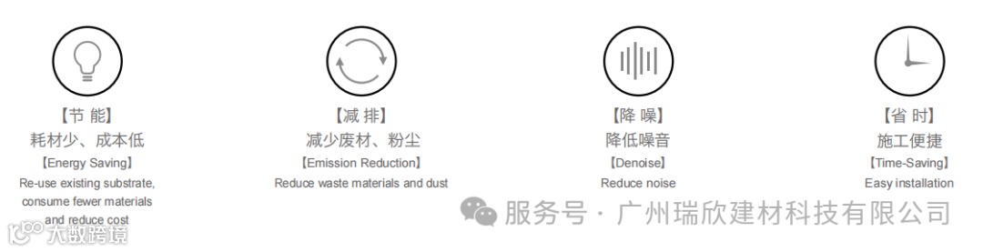 传统翻新旧改需将原墙面铲除后重新做基层及防水后再贴产品,不仅需要耗费大量时间、人力、物料成本,且会对生活品质造成极大影响。如在施工改造期间不仅需要业主本人监管工人施工进度及施工质量,且厨房及卫生间无法正常使用,施工期间亦会产生大量噪音影响周边邻居投诉等等一系列情况,令人费心费神。