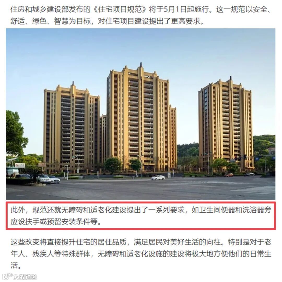2025年住宅项目规范中明确提出了需在卫生间便器及洗浴器旁设置扶手的要求,由此看出国家对适老化建设的重视。
