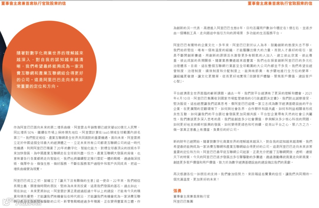 财报中,阿里巴巴董事局主席兼CEO张勇在致股东的信中称,“很多变化对于阿里巴巴来说,也是一种全新的经历”。但幸运的是,身处中国这个全球最大的消费市场,以及背靠中国这个全球最有韧性、最具活力的供应链体系,都给予了其坚定不移长期增长、创造更多价值的信心。