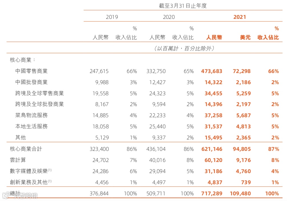 尽管来自核心商业的收入增速有所放缓,但也可以明显看到,在过去三年,核心商业(含国内外零售业及批发商业,菜鸟物流服务和本地生活服务板块)的收入在总收入占比分别达到86%、86%、87%。