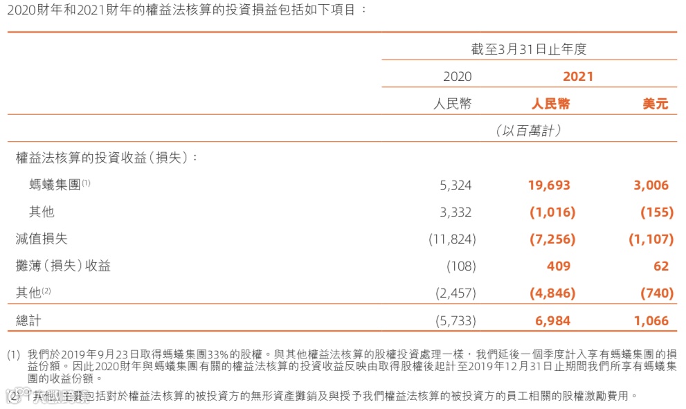 阿里巴巴披露2021财年年报,按权益法核算,2020年4月至2021年3月末,阿里巴巴的投资收益为69.84亿元,其中录得蚂蚁集团的收益为196.93亿元。