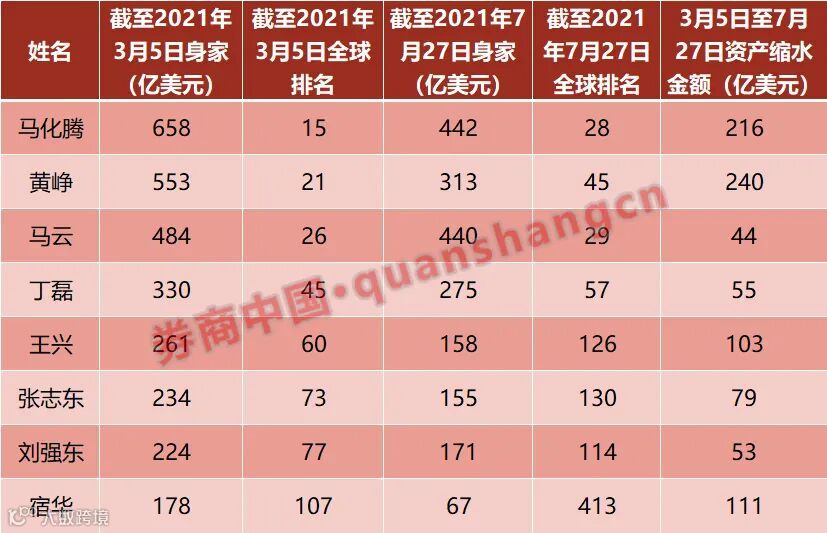 而根据福布斯实时富豪榜,截至7月27日券商中国记者发稿,马化腾的身家已缩水至442亿美元,全球排名跌至第28位;拼多多创始人黄峥的身家为313亿美元,全球排名跌至第45名;马云的身家跌至440亿美元,排名全球第29名;网易创始人丁磊身家跌至275亿美元,排名掉到了第57名;美团创始人王兴身家缩水至158亿美元,全球排名掉到了第126名;腾讯创始人张志东身家缩水至155亿美元,排名第130名;刘强东的身家缩水至171亿美元,排名第114名。快手创始人宿华的身家缩水至67亿美元,排名第413名。