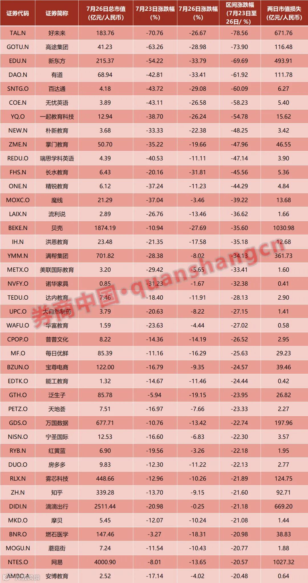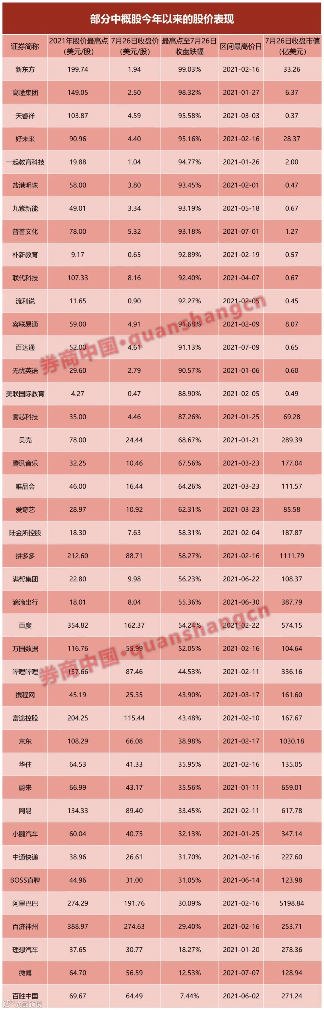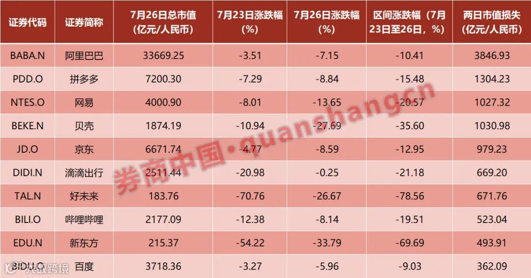 统计数据显示,这两天,在美上市的好未来、高途集团、新东方股价跌幅分别达到78.55%、73.90%、69.69%;阿里巴巴、拼多多、网易、贝壳、京东、滴滴出行分别下跌10.41%、15.48%、20.57%、35.60%、12.95%、21.18%。中概股总市值合计蒸发了2500亿美元,约合人民币1.6万亿元。