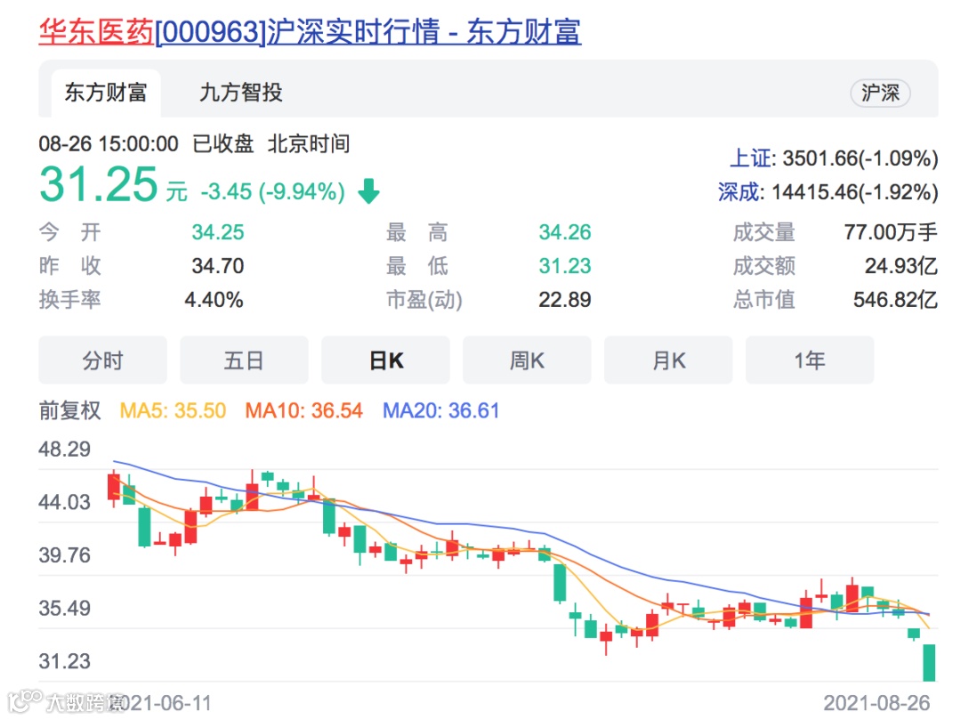 8月26日,华东医药低开低走,盘中一度躺平,最终收跌9.94%,近两天累计跌逾14%,最新市值为547亿元。这源于前天晚上公司发布的一则公告。