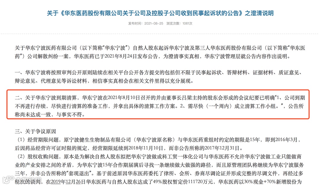 在这种情况下华东宁波自然人股东单方面向法院提出起诉,要求提前解散华东宁波公司,华东医药和华东宁波自然人股东间就公司是否提前解散事宜产生争议。