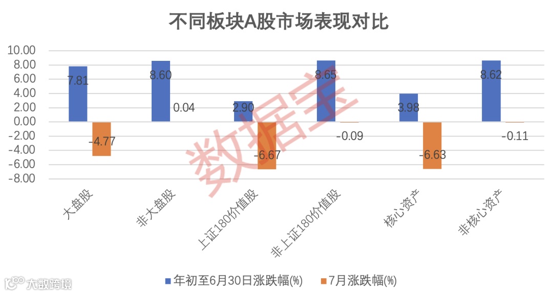 白马股、蓝筹股、核心资产、价值股跌跌不休,大盘股7月份以来平均下跌4.77%,非大盘股平均上涨0.04%;上证180价值股平均跌幅超过6.5%,其余个股平均跌幅不到0.1%。即便是今年前6个月,白马股、大盘股、价值股等市场表现也相对较弱,这些曾经的明星股,如今已经被部分认为是不再具备投资价值。