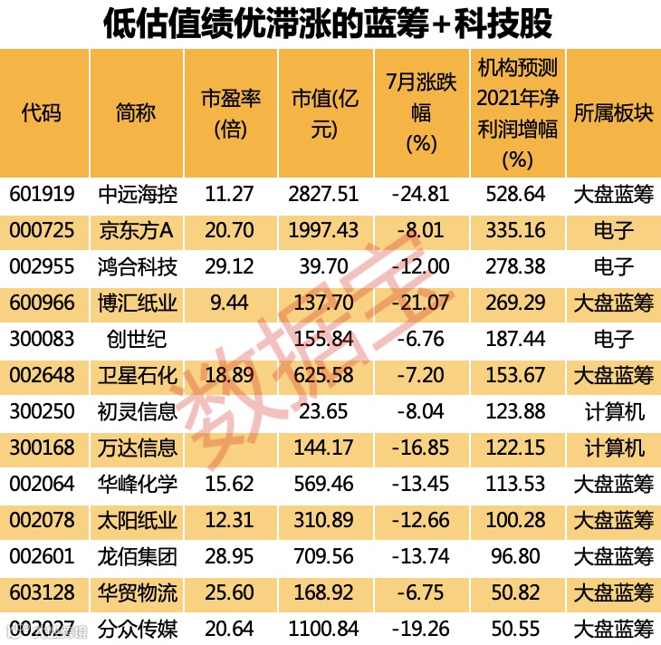 根据上述逻辑,数据宝筛选科技、蓝筹领域:估值低于30倍,7月份跑输大盘,机构预测2021年净利润增幅有望超50%,中报业绩预喜股仅有13只,科技股仅有5只,包括初灵信息、创世纪等。