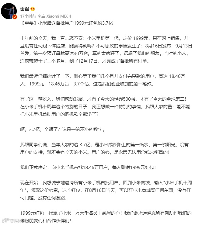 在昨晚的新品发布会上,为了感恩米粉的支持,雷军宣布,向小米手机1首批18.46万用户,每人赠送 1999元红包,总金额将达3.7亿元。雷军称,这个红包,在8月16日当天,可以在小米商城买任何东西,没有任何门槛,没有任何套路。