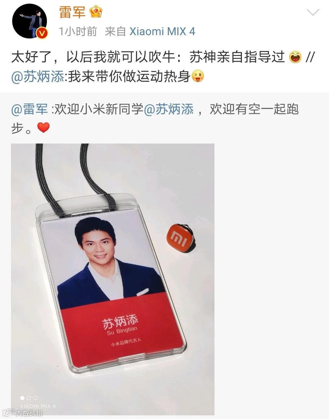 8月11日上午,雷军还在微博上与苏炳添互动,雷军说,“欢迎小米新同学苏炳添 ,欢迎有空一起跑步。”苏炳添回应称,“我来带你做运动热身。”雷军高兴的像个孩子,他说,太好了,以后我就可以吹牛:苏神亲自指导过!