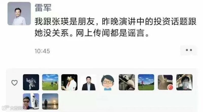 此外,雷军第一时间发朋友圈回应称:“我跟张瑛是朋友,昨晚演讲中的投资话题跟她没关系,网上传闻都是谣言。”