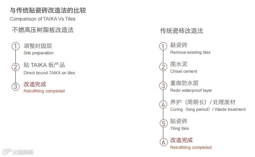 瑞欣翻新旧改有别于传统旧改方法,传统翻新旧改需将原墙面铲除后重新做基层及防水后再贴产品,不仅耗时且产生过多建筑垃圾,增加了不少人工成本。瑞欣不燃高压树脂板可直接粘贴于原墙面,不拆除不破坏防水层,尺寸深化后现场直接安装,不产生建筑垃圾、不产生噪音扰民。