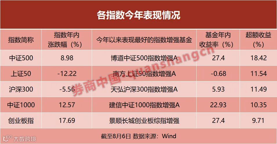 截至8月6日,中证500指数年内涨幅为8.98%,而据Wind数据统计,有36只中证500指数增强基金均获得了超越指数的超额收益,其中最高的年内收益高达27.4%,超越中证500指数18个百分点,由博道中证500指数增强A摘得,在同类39只中证500指数增强基金中排名第一。