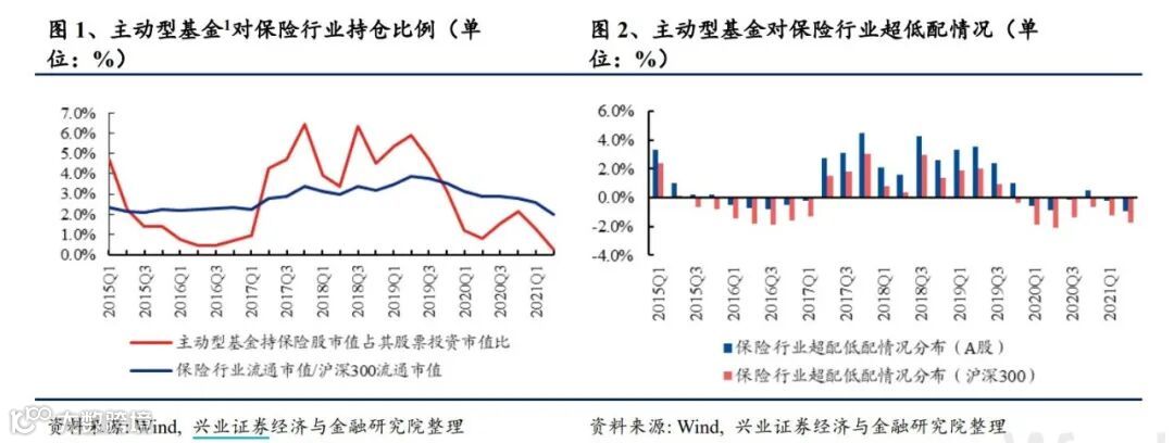 据兴业证券经济与金融研究院统计,2021年二季度,主动型基金低配保险板块,持股市值占比为0.2%,环比-1.08pct,相较沪深300低配1.77pct,保险持仓占比触五年最低点,个股持仓环比也普遍下降。