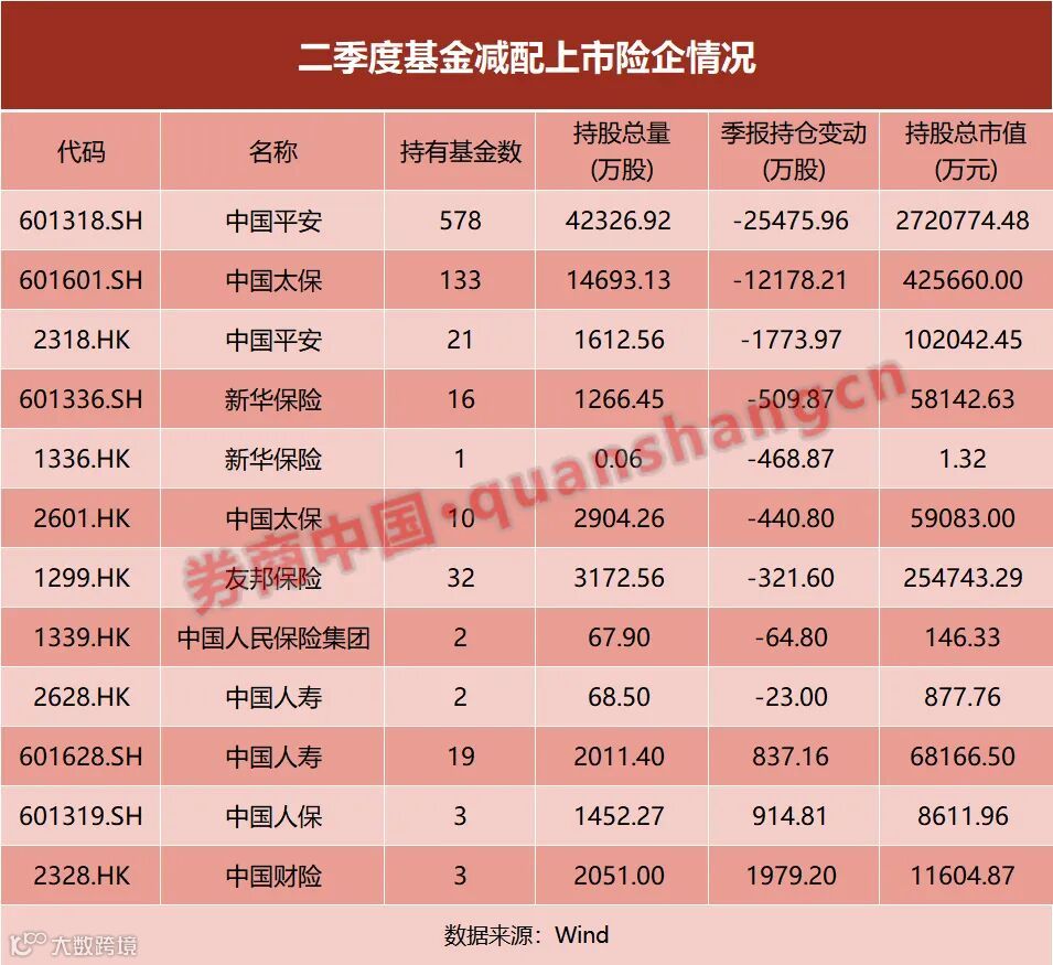 具体来看,Wind数据显示,中国平安、中国太保、新华保险、友邦保险、中国人保等多家险企均在二季度遭遇基金减持。环比来看,基金对中国平安、中国太保、新华保险持股数量环比下降73.5%、75.4%、59.2%至0.63、0.35、0.02亿股,持仓市值环比下降78.4%、81.1%、61.5%,板块内持仓比例最高的中国平安和中国太保持股市值环比降幅八成左右。