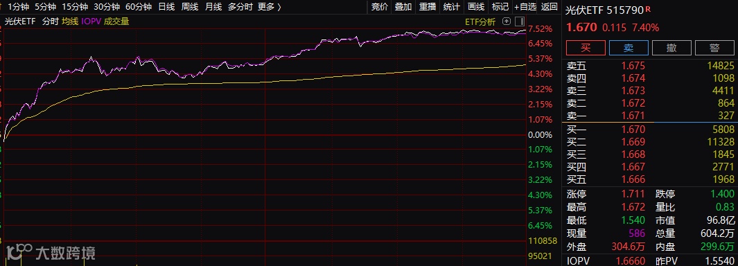 太能阳板块亦十分火爆。光伏ETF狂飙超7%,光伏龙头隆基股份大涨8%。