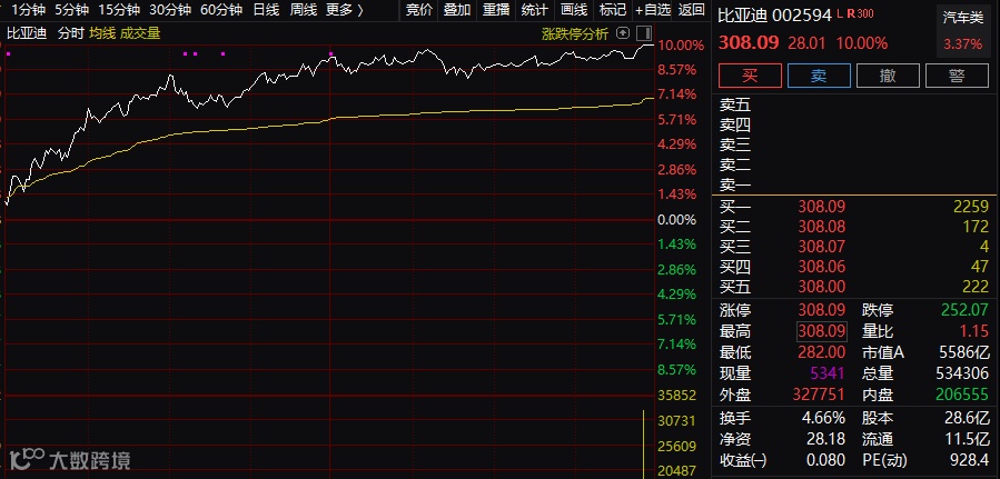 今天,上证指数收涨0.85%,创业板指涨2.47%。新能源车产业链全面爆发。比亚迪A股尾盘封涨停,股价突破308元,总市值超8000亿元;H股涨超8%。