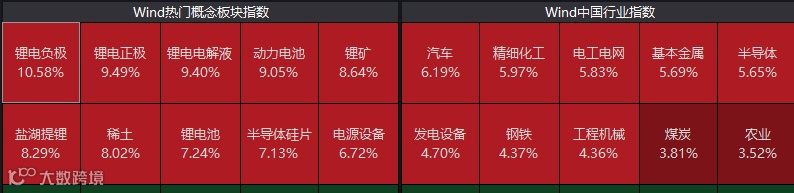 经过两天的调整之后,今天锂电、光伏、稀土和半导体等板块再度强势回归。其中,锂电行情尤其凶猛。新能车巨头比亚迪尾盘封死涨停板,总市值超8000亿元;另一巨头宁德时代亦狂涨超7%,锂电负极指数更是暴拉10.58%。此外,光伏ETF大涨7.4%,稀土指数狂拉超8%。