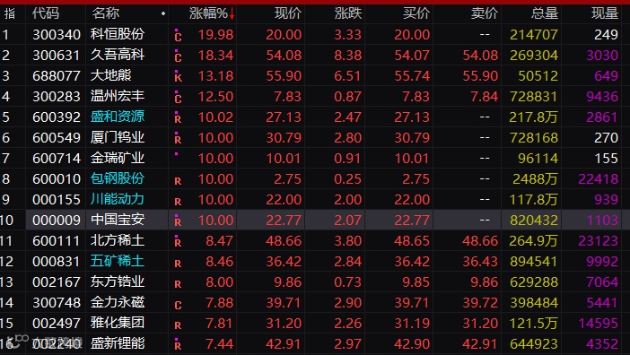 稀土板块表现也十分火爆,稀土永磁板块涨停个股高达10只,稀土指数暴涨超8%。