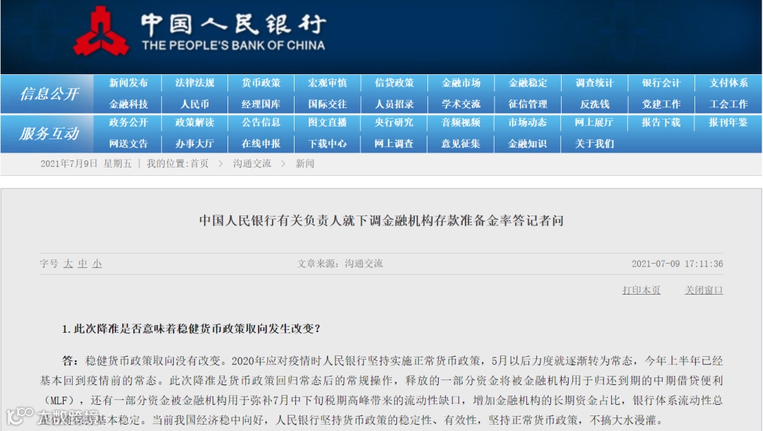 7月9日,央行发布消息称,为支持实体经济发展,促进综合融资成本稳中有降,中国人民银行决定于2021年7月15日下调金融机构存款准备金率0.5个百分点(不含已执行5%存款准备金率的金融机构)。此次降准为全面降准,除已执行5%存款准备金率的部分县域法人金融机构外,对其他金融机构普遍下调存款准备金率0.5个百分点,降准释放长期资金约1万亿元。本次下调后,金融机构加权平均存款准备金率为8.9%。