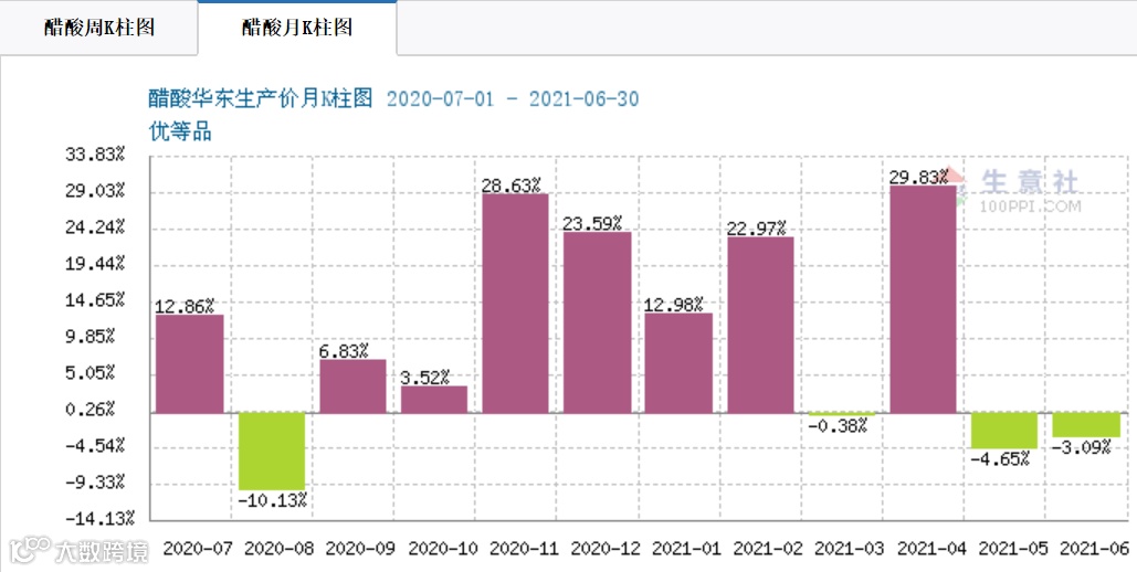 去年7月以来醋酸每月涨幅情况(来源:生意社)