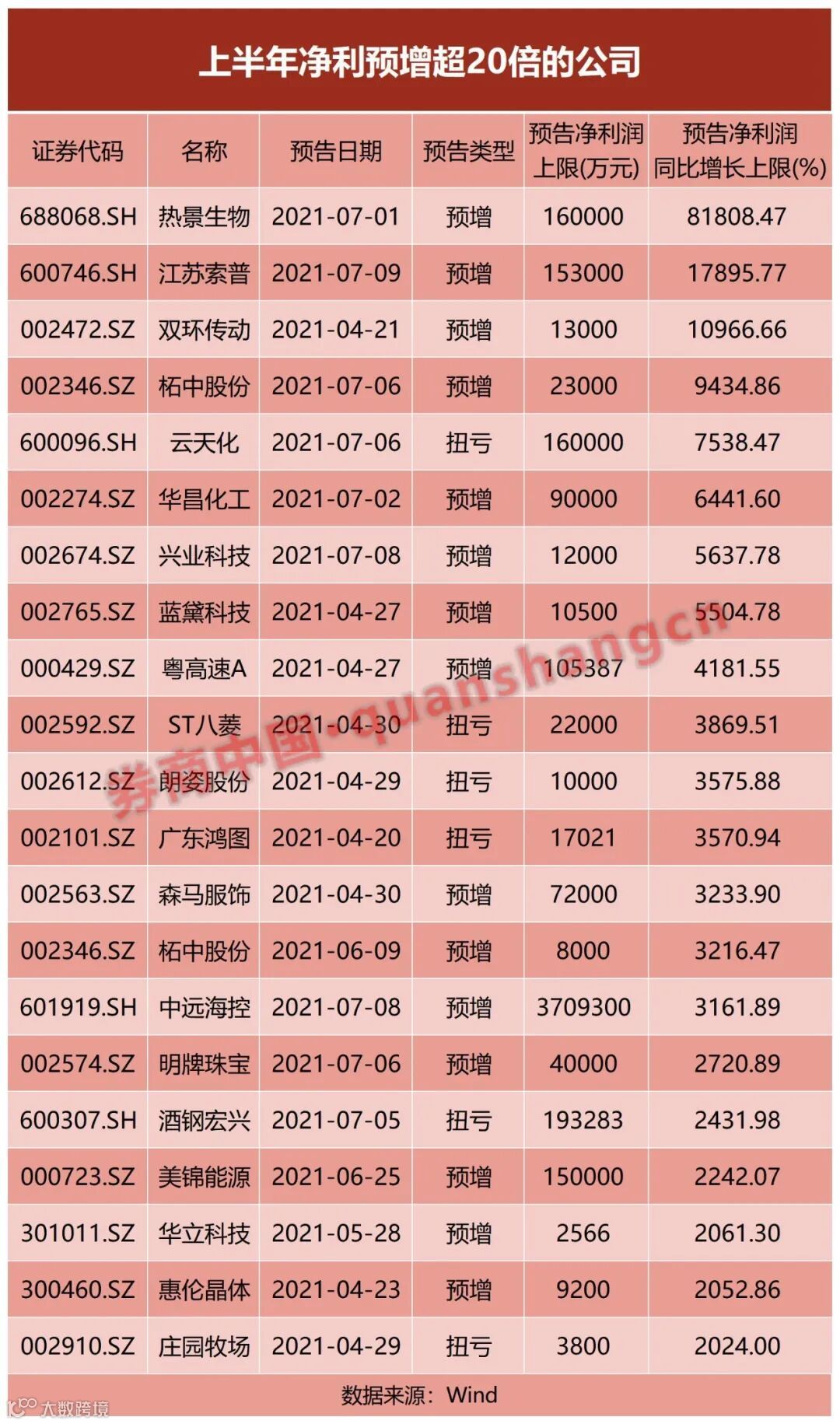 截至目前,A股市场已有800多家公司发布了上半年业绩预告,其中预增幅度超过1000%的公司达38家,预增幅度超过20倍的公司有21家。其中,热景生物以超过800倍的预增幅度成为目前的“预增王”,江苏索普则成为预增榜亚军。