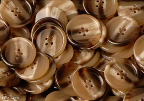 牛角扣来自水牛牛角,坚硬度较好。天然牛角扣是黑色或者浅黄,其中会有一些斑点、纹路。追求品质的西装会选择纹路相似的纽扣,这样看上去比较像一个系列。