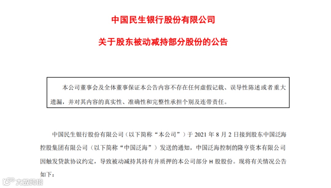 根据公告,民生银行于8月2日接到股东中国泛海的通知,隆亨资本被动减持该行H股约1.19亿股,占该行总股本的0.27%,被动减持时间为2021年7月28日至30日。
