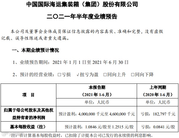 7月14日晚间,中集集团披露半年度业绩预告,预计2021年上半年净利润为40亿元至46亿元,上年同期为亏损1.83亿元。