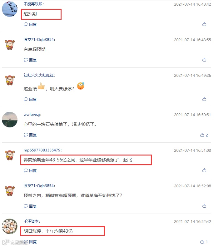 对于这份业绩,不少投资者表示超出预期了,有股民评论称,“券商预期全年48-56亿之间,这半年业绩够劲爆了,起飞。”还有股民直呼:“开盘涨停”。