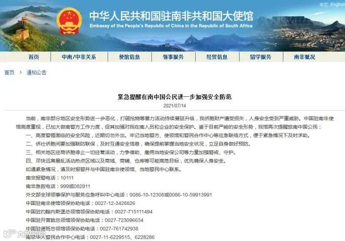 中国驻南非大使馆同日亦发布紧急安全提示,提醒在南华人华侨注意人身安全。这是中国驻南非大使馆两天内连续两次发布安全提示。