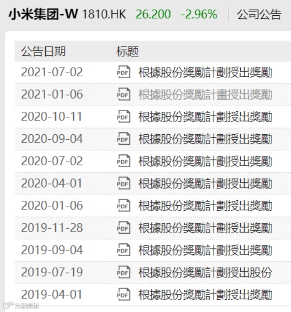 最近一次发生在2021年1月6日,当时一共给2405名员工授予了1686.63万股,当时的小米股价为33.90港元,授予股份的整体价值为5.72亿港元。