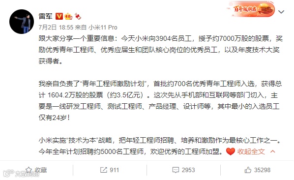 小米创始人雷军随后发布微博表示,小米实施“技术为本”战略,把年轻工程师招聘、培养和激励作为最核心工作之一。在以上员工中,首批约700名优秀青年工程师入选小米最新的人才激励项目“青年工程师激励计划”,他们获得总计1604.2万股的股票(约3.5亿元)。