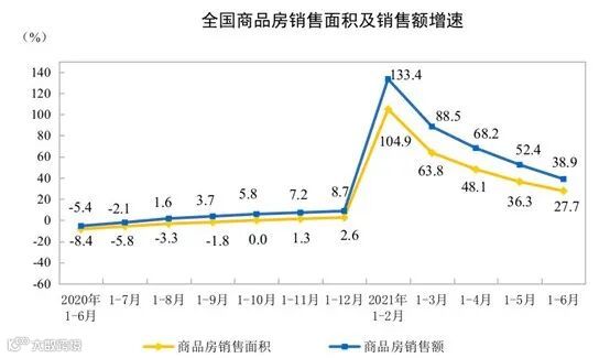 1-6月份,商品房销售面积88635万平方米,同比增长27.7%;比2019年1-6月份增长17.0%,两年平均增长8.1%。其中,住宅销售面积增长29.4%,办公楼销售面积增长10.0%,商业营业用房销售面积增长5.7%。商品房销售额92931亿元,增长38.9%;比2019年1-6月份增长31.4%,两年平均增长14.7%。其中,住宅销售额增长41.9%,办公楼销售额增长10.7%,商业营业用房销售额增长8.8%。