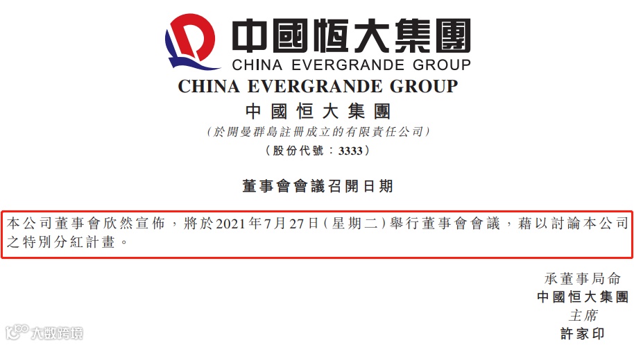 而缓解市场情绪的是一则特别分红公告,7月15日,中国恒大发布公告称,将在7月27日召开董事会会议,讨论特别分红计划。