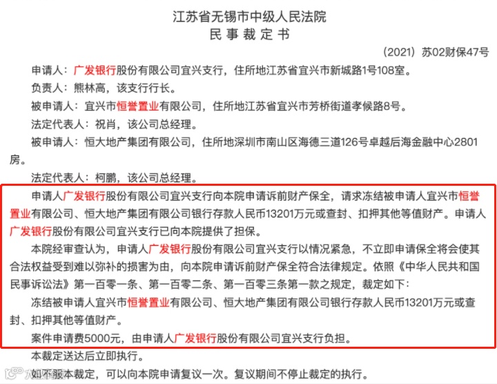 这份民事裁定书是7月7日江苏省无锡市中级人民法院签发的。文书称,广发银行宜兴支行以情况紧急,不立即申请保全将会使其合法权益受到难以弥补的损害为由,向该院申请诉前财产保全,请求冻结宜兴市恒誉置业、恒大地产集团的银行存款人民币13201万元或查封、扣押其他等值财产。