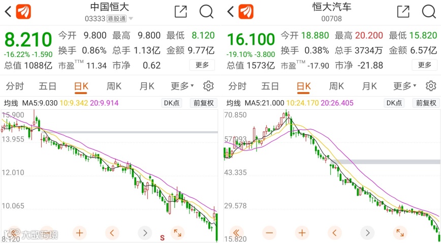 截至7月19日收盘,中国恒大总市值跌至1088亿港元,相比前一交易日,市值蒸发超209亿港元;恒大汽车单日蒸发市值超371亿港元,恒大系总市值累计蒸发740亿港元。