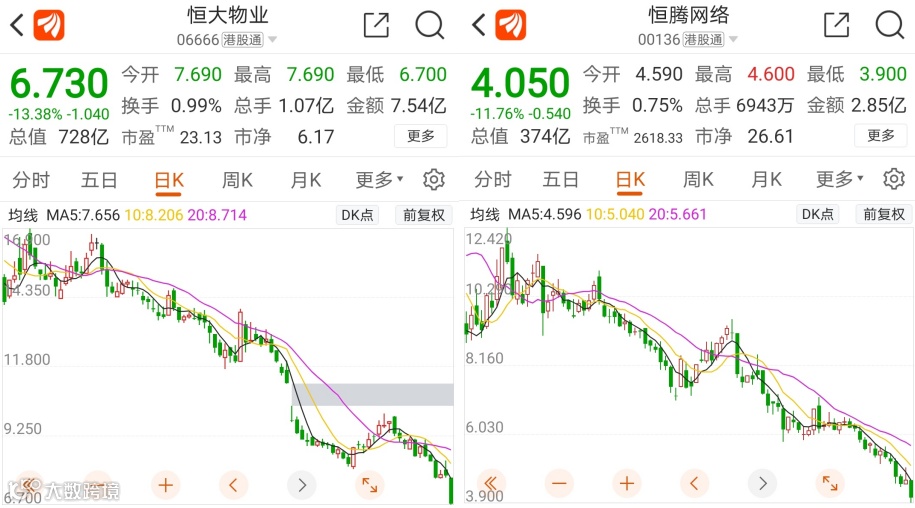 随后,恒大系集体大跌,截至收盘,中国恒大大跌超16%,恒大汽车暴跌近20%,恒腾网络跌近12%,恒大物业大跌13.38%,累计蒸发市值超740亿港元。另外,恒大系的债券亦集体大跌,“15恒大03”跌近13%、“19恒大02”跌超11%、“19恒大01”跌超11%。