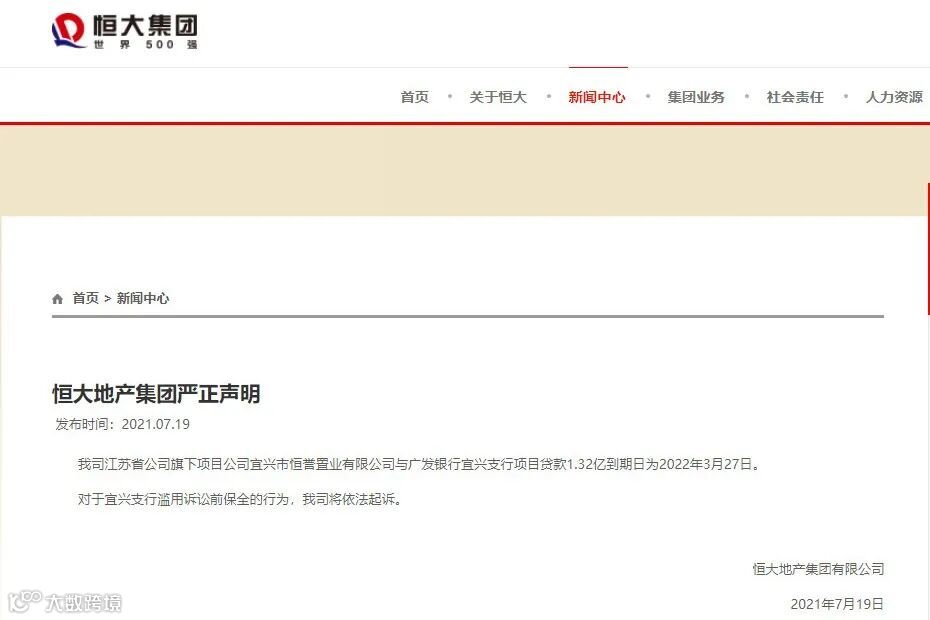这则裁判文书在7月19日被传开。恒大集团回复券商中国记者称,该公司江苏省公司旗下项目公司宜兴市恒誉置业有限公司与广发银行宜兴支行项目贷款1.32亿到期日为2022年3月27日。