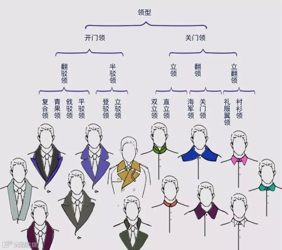 领型的变化多种多样,总体看来,按开合方式可分为开门领和关门领两大类,每一类又有诸多细化分支,大体变化如下: