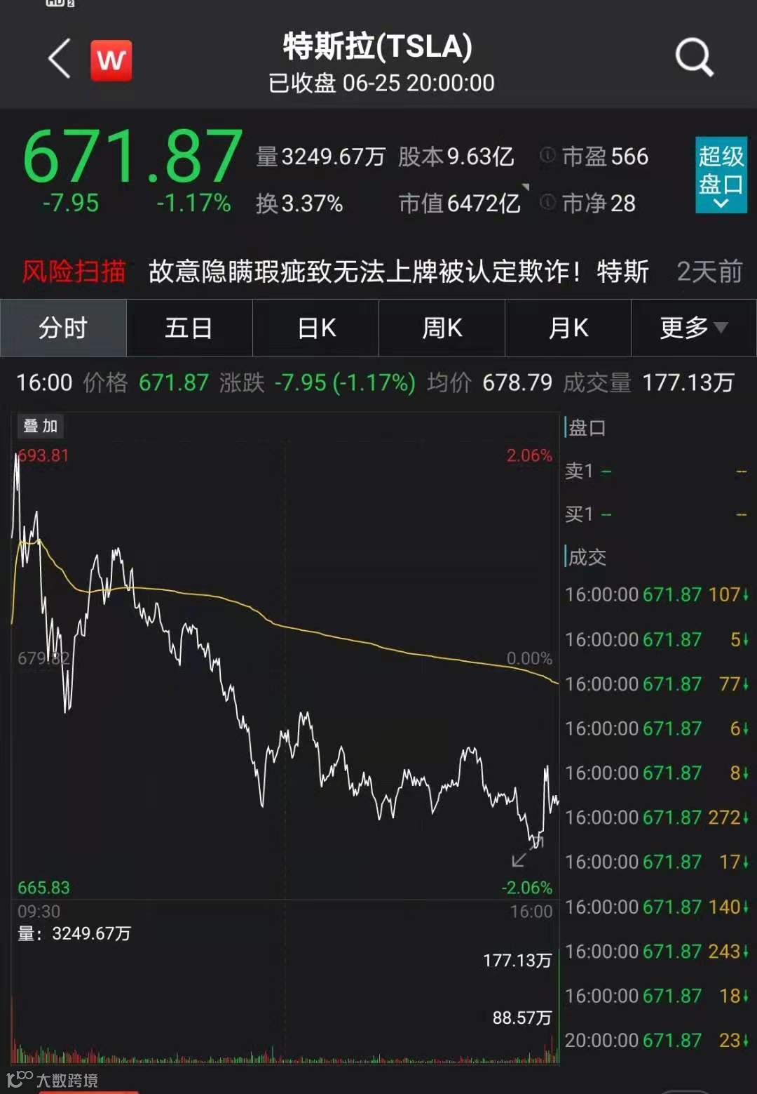 受此消息影响,6月25日特斯拉股价承压,全天震荡下跌,收盘跌1.17%。