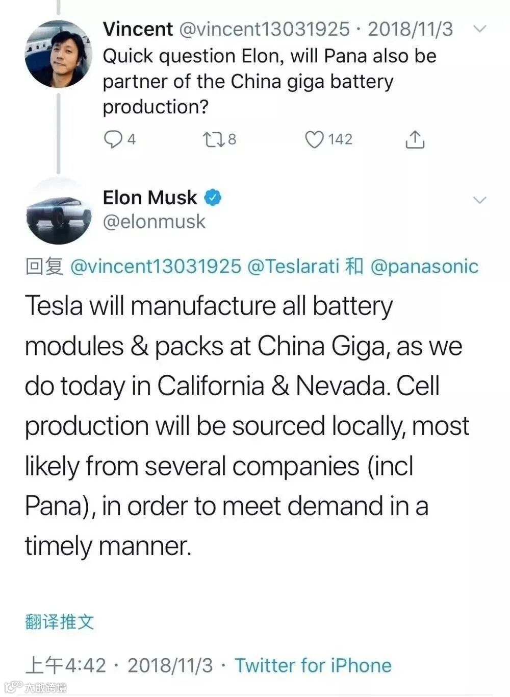 2018年11月,在确定了中国工厂已经实质性落地上海临港之后,马斯克通过twitter表示,中国工厂的电芯将由包括松下在内的几家公司本土化供应,为的是尽快实现投产。