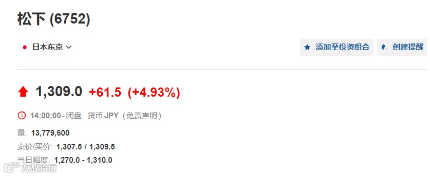 但是投资者们却认为这是一个重大利好。在6月25日的东京股市上,松下股价大涨近4.93%,升破1300日元,总市值3万亿日元(约合人民币1750亿元)。