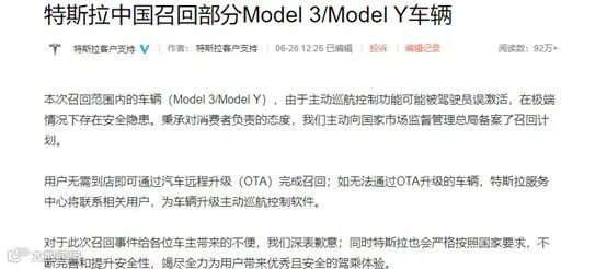 召回公告发布后,特斯拉汽车(北京)有限公司官方认证微博“特斯拉客户支持”发布了相关说明。