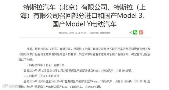 召回2019年12月19日至2021年6月7日期间生产的部分国产Model 3电动汽车,共计211256辆;2021年1月1日至2021年6月7日期间生产的部分国产Model Y电动汽车,共计38599辆。