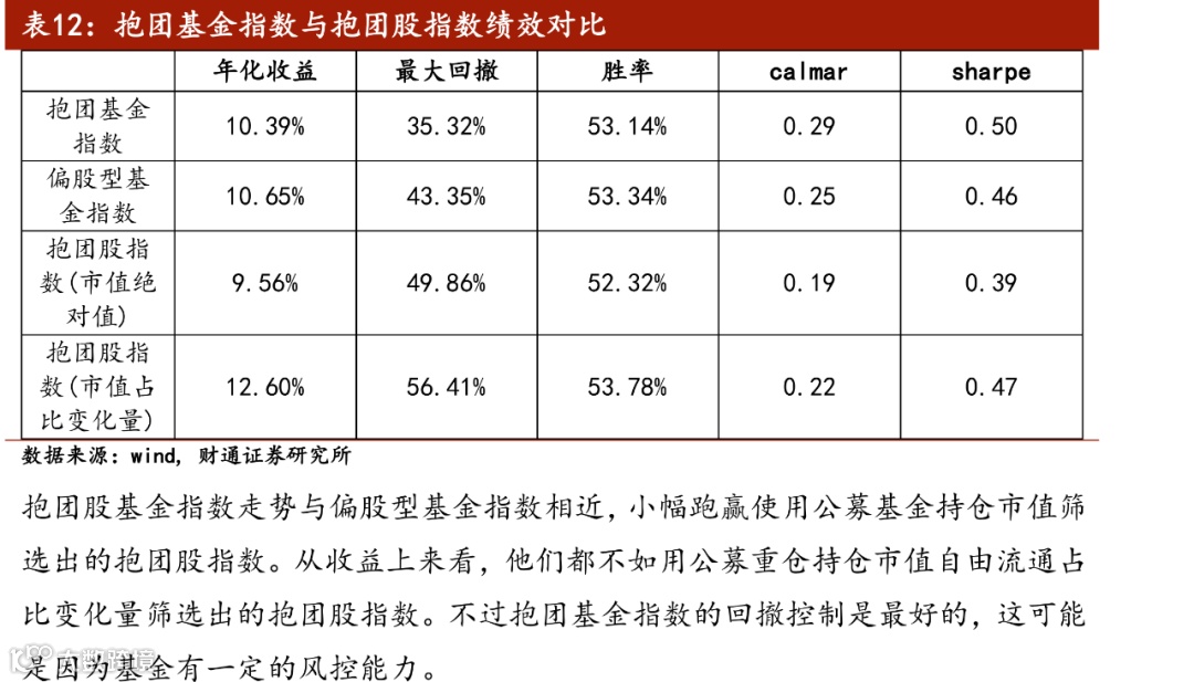 b) 不过抱团基金指数的回撤控制是最好的,这可能是因为基金有一定的风控能力。