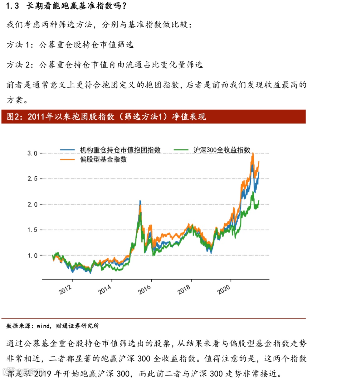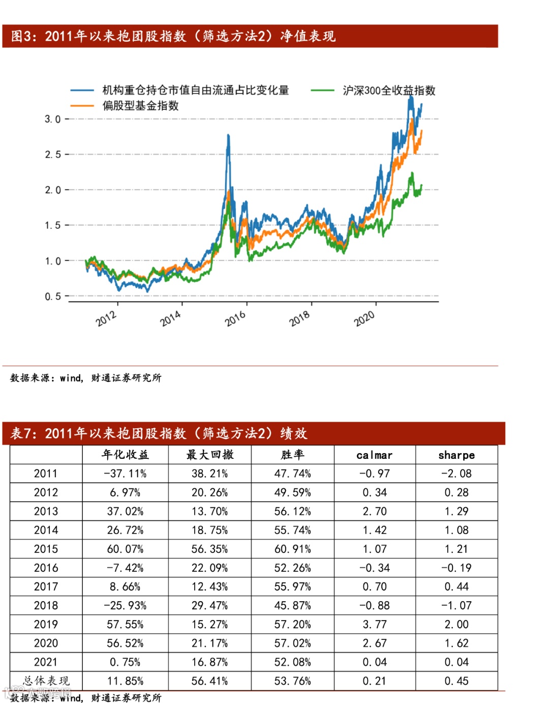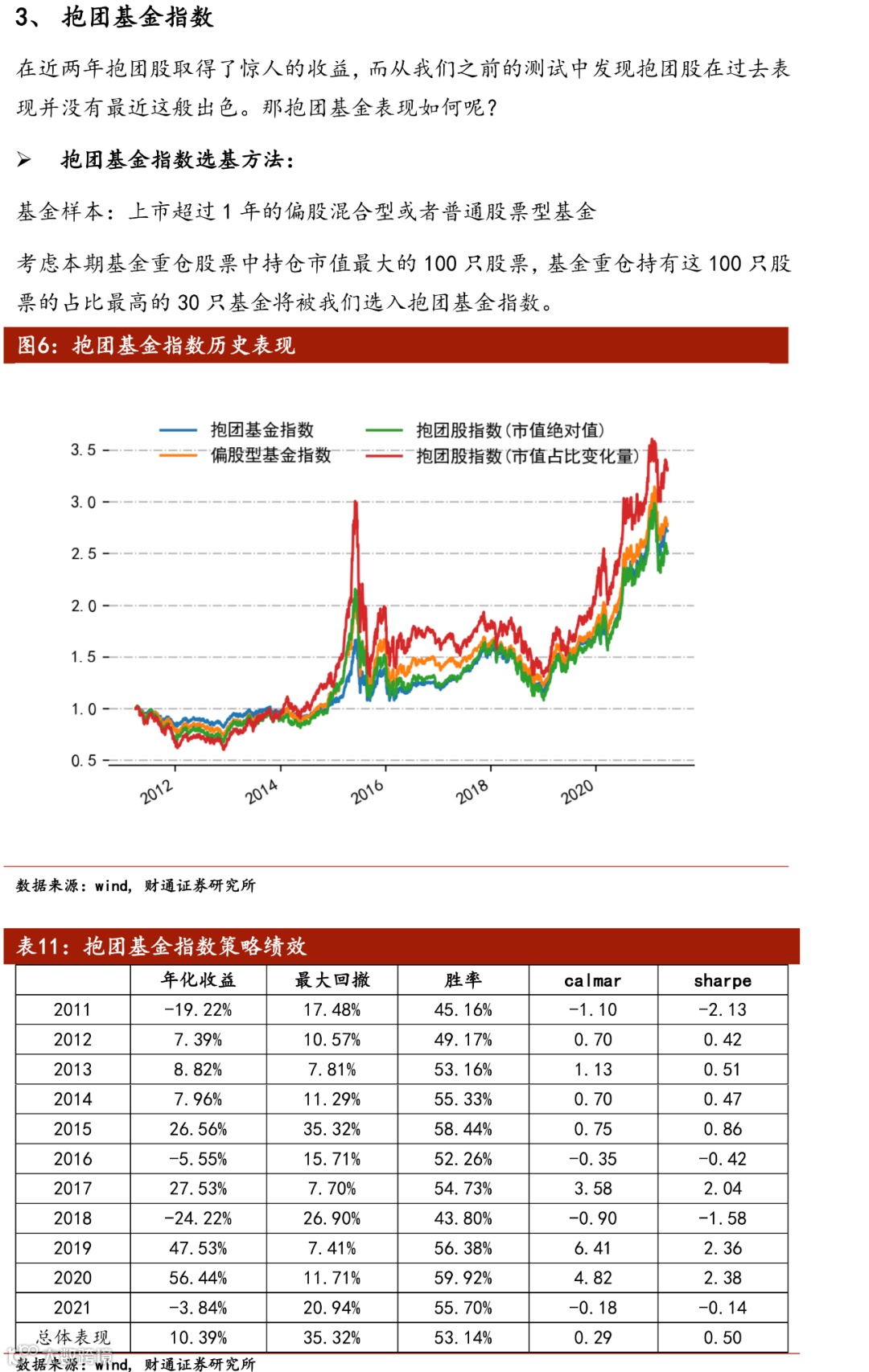c) 长期来看,通过公募重仓市值自由流通占比变化量筛选的抱团股指数小幅跑赢沪深300和偏股型基金指数,2011年1月—2021年7月,年化收益达到11.85%。