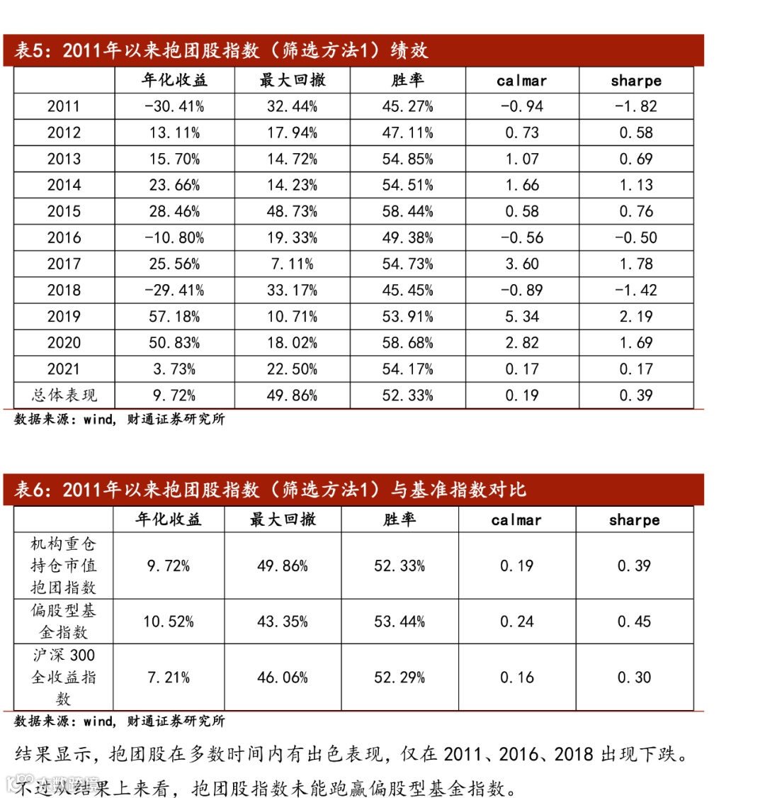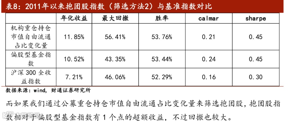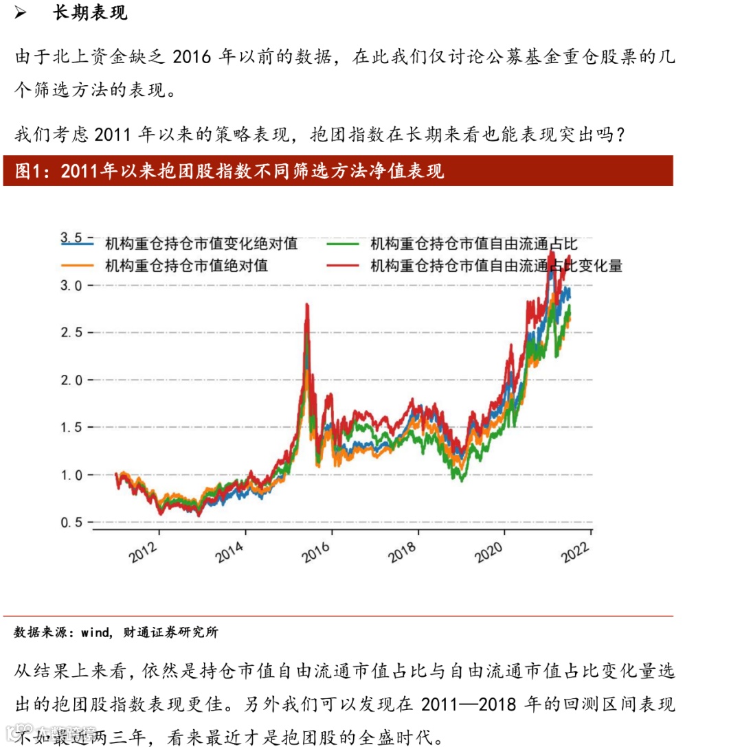 c) 长期来看,通过公募重仓市值自由流通占比变化量筛选的抱团股指数小幅跑赢沪深300和偏股型基金指数,2011年1月—2021年7月,年化收益达到11.85%。