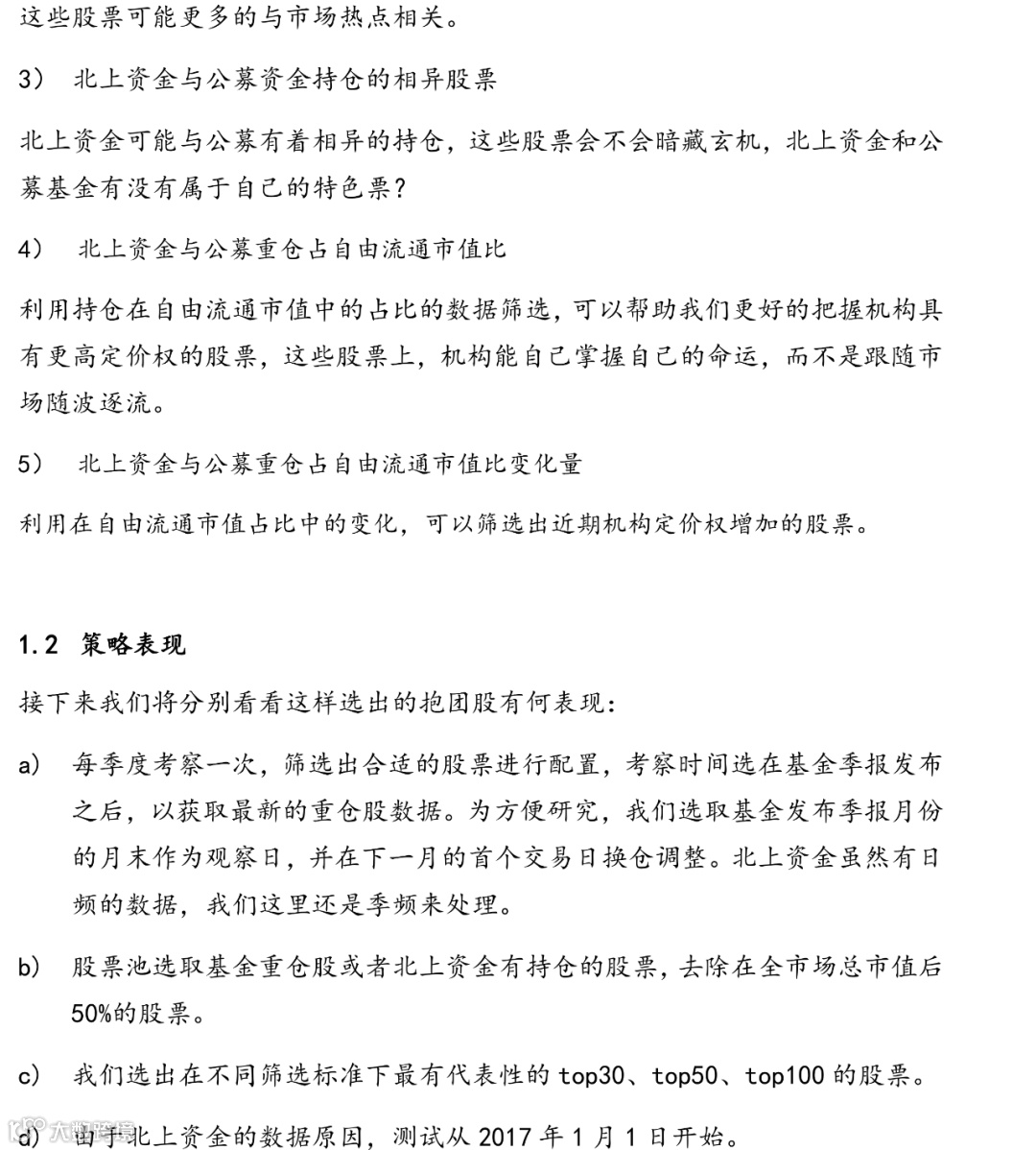 b) 我们构建了5类抱团股筛选方法,发现在这些筛选方法中,通过北上资金持仓市值自由流通占比筛选出的抱团股有最好的表现,2017年1月—2021年7月,策略年化收益达22.49%,sharpe达到0.92。